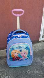 Zaino trolley Frozen con doppio scomparto a 2 tasche: la prima è più grande e spaziosa, mentre la seconda più piccola, ma sempre molto capiente. Barra singola telescopica. Fondo preformato rigido e rinforzato per garantire la stabilità del prodotto e la protezione del contenuto. Ruote molto robuste. Spallacci a scomparsa totale nello schienale quando utilizzato come trolley. Sostituendo le batterie, si attivano luci a led colorati funzionanti nella tasca piu' piccola.
