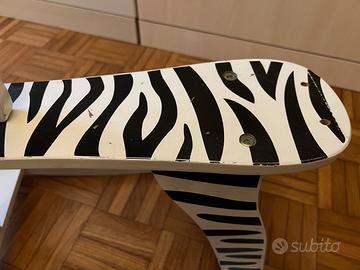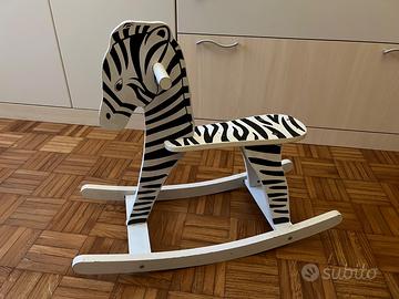 Cavallo a dondolo a forma di zebra, in legno. Qualche segno di usura. Altezza sedile da terra 28cm.