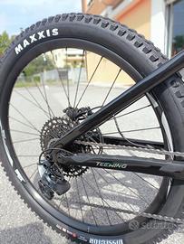 Nuova Teewing Turbo Force-in pronta consegna taglie M - L - Listino 6.999,00 Teewing Turbo Force ridefinisce il concetto di e-mountain bike con un motore Avinox all'avanguardia che eroga 105 Nm di coppia in un design elegante e compatto. Costruita su un telaio in carbonio Teewing Turbo Force leggero ma rigido, offre una maneggevolezza agile e un'esperienza dinamica sui sentieri. Completa il tutto una trasmissione SRAM GX Eagle per cambiate fluide e prestazioni affidabili, abbinata alla morbida forcella RockShox FS Lyric BASE e all'ammortizzatore posteriore DELUXE SELECT+ per assorbire ogni asperità. Possibilità di spedizione, prezzo scontato è da considerarsi senza ritiro usato, in caso di permuta contattateci per una valutazione. - Telaio: Teewing Turbo Force Carbon Frame, 29'' rear wheels, 150mm rear travel - Motore: Avinox M1 Drive Unit 105 Nm - Display: Avinox, display di controllo OLED da 2 pollici + Comandi remoti wireless Avinox lati destro e sinistro - Batteria: Batteria integrata Avinox 800 Wh - Caricabatterie: Caricabatterie rapido Avinox 12A/508W - Forcella: Rockshox FS Lyrik BASE , 29" BOOST, 15X110mm, 160mm travel, 44mm rake - Ammortizzatore: Rockshox Deluxe SELECT+, Trunnion (185mm×55mm), linear air can - Cambio: SRAM GX Eagle Transmission, 12v - Deragliatore: / - Comando cambio: SRAM GX EAGLE TRIGGER LUNAR - Pacco pignoni: SRAM PG-1230-A1, 11-50D - Catena: SRAM NX Eagle 120 link, 12v - Corona: SRAM Eagle Transmission E-MTB Chainring 104 BCD 36D - Pedivelle: Pedivella DJI Avinox SL 160 mm) - Freno anteriore: SRAM MOTIVE BRONZE, 4 pistoni - Freno posteriore: SRAM MOTIVE BRONZE, 4 pistoni - Dischi: Centerline 200mm / Centerline 200mm - Copertone anteriore: Maxxis Assegai MaxxTerra 29×2.5" WT 3C EXO + E-25 TLR- Copertone posteriore: Maxxis Dissector MaxxTerra 29×2.4" WT 3C EXO + E-25 TLR - Cerchi: Breo-X7701E, Alloy Flat Welding, 29'', 30mm internal width, 32H, tubeless ready