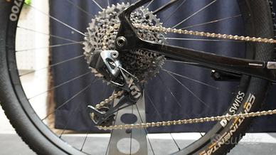 Questo esemplare in taglia S è equipaggiato con SRAM X01 AXS elettronico 12 velocità, con corona 34T e cassetta 10-52, per una trasmissione fluida e precisa in ogni situazione. La forcella Fox 32 con trattamento Kashima garantisce massima scorrevolezza, mentre le ruote DT Swiss X1700 offrono affidabilità e rigidità. L’allestimento è completato da manubrio integrato Ursus in carbonio, reggisella telescopico e potente impianto frenante Magura MT-8 Carbon.