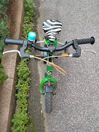 - (verde) con ruote da 12” marca Legnano, in condizioni eccellenti e perfettamente funzionante, con doppi freni a pinza e leve in metallo, sella morbida con maniglia, campanello, cerchi in alluminio e rotelle.