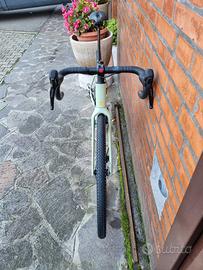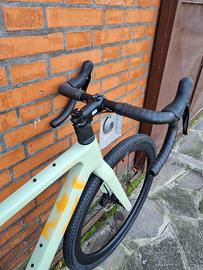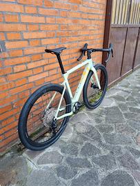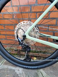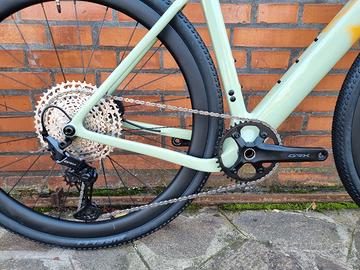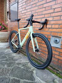 Questo esemplare color "salvia" è montato con gruppo Shimano Grx 1x12 meccanico, con pacco pignoni 10/51 e guarnitura da 40 denti . Le ruote sono le 3T Discus 40-30 in carbonio gommate Pirelli 700x45 .