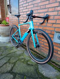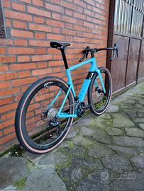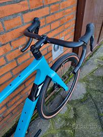 La bici è montata con il gruppo Shimano Grx 2x12 Di2 (elettronico) con guarnitura Grx 46/30, pacco pignoni 11/36, freni a disco idraulici.