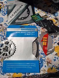 shimano pacco pignoni 10 v (13/28 + 27 extra) catena 10 v ( nuova ) pedali keo classic, pulisci catena mai aperto , cuffie per freni, pattini freni , corona 34v ( nuova ) guaine per cavi ( nuovi)