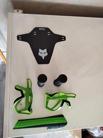 Vendo accessori smontati da bici MTB nuova mai usati solo montati ma subito sostituiti per cambio colore/modello. Manopole 130mm e 30 di diametro in gomma con anello interno a brucola per fissaggio + paracatena in gomma + 2 portaborraccie ad estrazione laterale acid + paraspruzzi da forcella Fox .