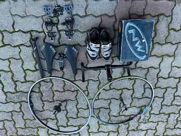 Due selle fisik airone leggerissime , un paio di scarpe 42 nuove , attacchi pedali con accessori manubrio con attacco di 11 e un altro attacco manubrio cannondale di 11 un tubo selladie ruote leggerissime da cambiare il cuscinetto alla ruota libera per il resto sono in buone condizioni .