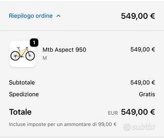 DESCRIZIONE Scott Mtb Aspect 950 La SCOTT Aspect 950 è una bici hardtail leggera, efficiente e con un ottimo rapporto qualità/prezzo. È la bici perfetta per chi ha da poco scoperto la mountain bike perché equipaggiata con freni a disco e componenti Syncros. Telaio in lega di alluminio Aspect 700/900 Forcella Suntour XCT30-HLO 100 mm Shimano Altus 18 velocità Freno a disco idraulici Tektro Kenda Booster vendo per passaggio bici corsa usata 2 volte in piu regalo casco scoot borsa attrezzi pompetta supporto telefono tutto 450€ prezzo non trattabile sella antinprostata in piu quella originale syncros