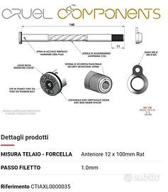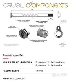 Vendo per cambio bici, assi passanti CRUEL COMPONENTS 12x100 e 12x142 comprensivi di nut filettati per Focus Izalco Max con sistema R.A.T. . Condizioni pari al nuovo veramente belli e leggeri 27+33 grammi. pagati 130 (ss comprese) vendo solo perché inutilizzati.