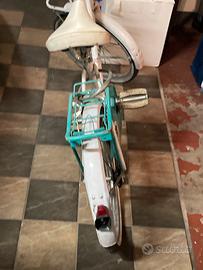Bicicletta bianca e azzurra. Supporto per cestino anteriore e porta pacchi posteriore