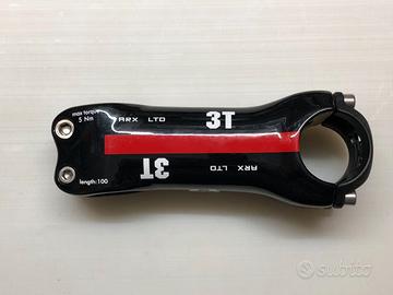 Vendo attacco manubrio in carbonio 3T lunghezza 100 mm inclinato 6° attacco diametro 31,8 mm . Smontato da bici nuova e poi dimenticato in garage.