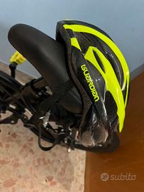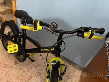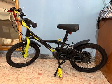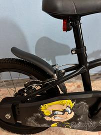 Per bambini dai 4 ai 6 anni, con un'altezza compresa tra 105 cm e 120 cm. Telaio in acciaio, dotata di parafanghi, copricatena e cavalletto. Copertoni gonfiabili con camera d'aria e tasselli. Le luci anteriori e posteriori e le rotelle stabilizzatrici sono incluse, incluso anche il casco. Presenta segni di usura, la bici presenta anche dei segni colorati che si levano facilmente con un panno bagnato Prezzo leggermente trattabile