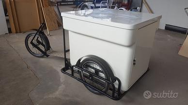 Monopattino Cargo con Banco / Cassone in vetroresina adatto per molti utilizzi come Banco per vendere Gite o Escursioni, Promozioni di prodotti, Banco mobile in Fiere o eventi, distribuzione Depliant, Punto Informazioni e Info Point.