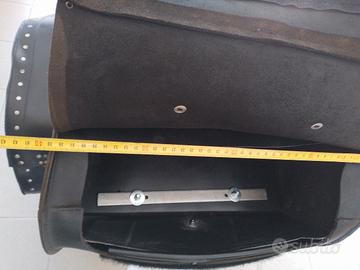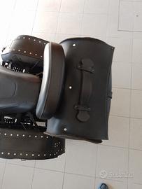 bauletto in cuoio, all'interno scocca in plastica sagomata, si fissa al portapacchi/sissybar con 2 piattine in acciaio e i relativi dadi e bulloni in dotazione .