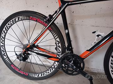 Vendesi bici, bicicletta da corsa strada con telaio in carbonio taglia L, passaggio cavi interno, ottime condizioni, trasmissione Shimano 105 completa. Cerchi Marchisio Carbozefir Oversize full carbon profilo alto, pista frenante in carbonio, tacchette freni per carbonio. Il prezzo di 700 euro si riferisce alla vendita diretta ma si valuta eventuale scambio o permuta con mtb 29 o gravel.