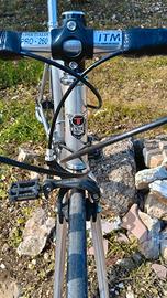 Bici da corsa anni 90 Sintesi Zefiro Telaio alluminio grezzo sverniciato, misura S/M (tubo piantone 52cm, tubo orizzontale 54cm) Manubrio ITM, canotto sella 3T, 18 rapporti (9x2), gruppo Shimano Tiagra con comandi Sunrace R90, Freni Miche Performance, Cerchi Gipiemme Tecno 716 a 16 raggi, pneumatici Continental 25mm. Peso 9,7kg senza pedali. Incluso porta borraccia, borsello sotto sella con 2 caccia copertoni e 2 camere d'aria.