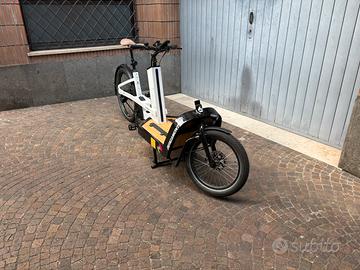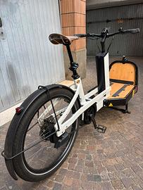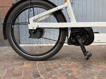 Bergamont LJ eCargo Elite 50cm, aprile 2025. 1337km. Ottime condizioni, utilizzata solo in città e sempre ricoverata in garage. Pianale da 50cm con anelli di ancoraggio. Motore Bosch Cargoline. Batteria Bosch 625Wh. Trasmissione automatica (Enviolo) a cinghia. Sellino telescopico. Insieme alla bicicletta: sella originale, load rails (pianale ancora non forato), telo copertura da pioggia (mai utizzato).