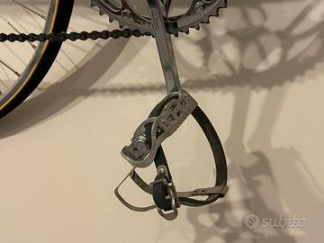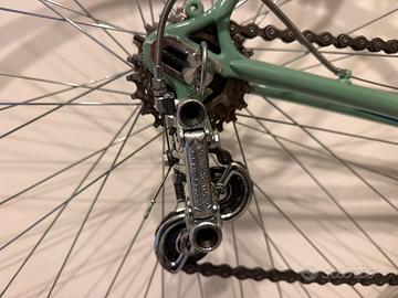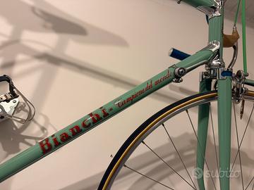 Vendo splendida bicicletta da corsa Bianchi del 1953, modello Campione del Mondo. Questo modello celebra la vittoria del Campionato del Mondo 1953 di Fausto Coppi a Lugano. Bicicletta totalmente smontata e restaurata professionalmente. La tonalità “Celeste Bianchi” è stata presa a campione dal set di parafanghi NOS in dotazione con la bicicletta. Le cromature sono originali, solo lucidate. Tutte le parti del gruppo cambio Campagnolo Gran Sport sono state pulite e rimontate mantenendo l’originalità. Così come il gruppo freni Universal ‘51 e la curva Ambrosio. La sella, una Brooks d’epoca è stata pulita e ingrassata. I mozzi presentano la stampigliatura ‘53 sui coni. I pedali, Sheffield con la famosa “B” di Bianchi ricavata nell’alluminio, sono originali e non repliche moderne. Le uniche parti sostituite con componenti nuovi sono: il nastro manubrio in cotone blu, coerente con la dotazione dell’epoca. I cavi con le guaine quadrettate fedeli all’originale. Una coppia di cinghietti in cuoio blu e per finire, i tubolari nero/para di Vittoria. Completano la bicicletta, un portaborracce cromato REG d’epoca con una borraccia (replica) in alluminio con tappo in sughero. Preferito lo scambio a mano. Eventuali spese di spedizione sono da concordare. Non svendo, non scambio, non permuto.