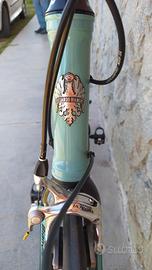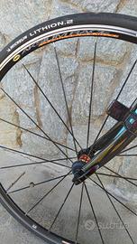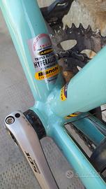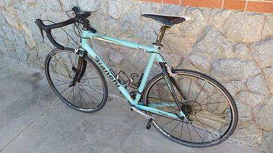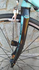 Bicicletta da corsa Bianchi Reparto Corse, modello FG Lite Hors Categorie. Taglia 59 sloping (tubo orizzontale 57,5 cm). Telaio in alluminio, forcelle in carbonio. Gruppo meccanico Shimano. Guarnitura Shimano 105, 50-34. Pacco pignoni Shimano Ultegra, 11-28. Freni a pattino Ultegra. Sella Fizik Arione. Pedali Look. Manubrio e reggisella in carbonio. Pipa da 80 mm (disponibile anche da 130 mm). Cerchi Mavic Aksium Race. Copertoni Michelin Lithion 2, 700x23C, a camera d'aria. Contachilometri Sigma BC 16.12 STS. Due portaborracce Elite. tag: bici