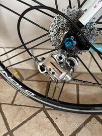 Ruote Campagnolo con profilo cerchio "Dpro", dotate di coperture Vittoria Zaffiro.Design: Presenta la classica colorazione "Celeste Bianchi" con dettagli bianchi e il tricolore italiano sulla forcella.