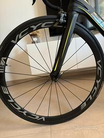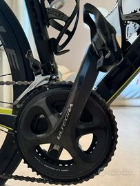 Telaio in carbonio, con gruppo shimano Ultralega 11 v meccanico e ruote in carbonio tubolare.