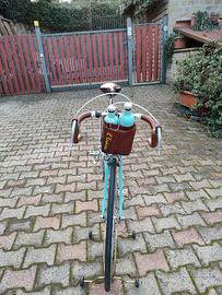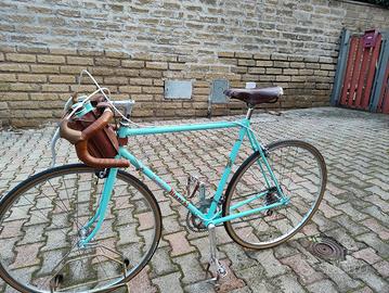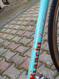 Bianchi Specialissima, 53×57 adatta a ciclisti di altezza sino 1,75 cambio Campagnolo, guarnitura 50/34 , cassetta 5 rapporti max 28. Ristrutturata con sabbiatura, fondo antiruggine, colore e trasparente. Ideale per ciclostoriche. Nastro manubrio Brooks. Ruote con cerchi per copertoncino. Freni nuovi ed efficienti. Porta borracce di pelle con borracce in tinta. Disponibile anche colore per futuri ritocchi.