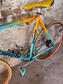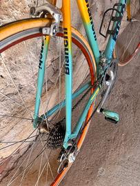 Vendo bicicletta da corsa Bianchi Mega Pro, livrea del Team Mercatone Uno, identica a quella che ha accompagnato Marco Pantani. Telaio: Alluminio 7000 Heat Treated Mega Pro, verniciatura originale in eccellenti condizioni, senza bozze o difetti strutturali. Forcella: Bianchi Carbon. Gruppo: Campagnolo Chorus (o Record) 9v completo e funzionante. Sella: Selle Italia Flite Titanium originale color giallo Mercatone Uno. Cockpit: Attacco manubrio giallo in tinta e manubrio Ritchey/ITM. Ruote: Cerchi anodizzati d'epoca con copertoncini. Pedali: Look Celeste Bianchi d'epoca inclusi. La bici è stata conservata con cura, è strutturalmente perfetta ed esteticamente "da esposizione". La meccanica è funzionante, ma se si prevede un uso stradale intensivo, consiglio una lubrificazione di rito essendo una bici d'epoca. Prezzo trattabile.