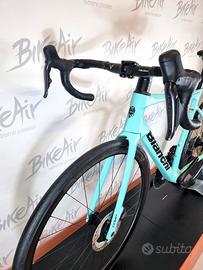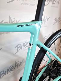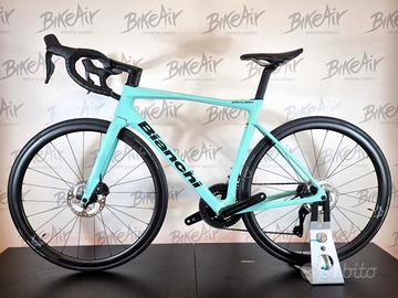 Bianchi Specilissima Shimano Ultegra Di2 Celeste Bianchi nuova. Disponibile solo in tg 55: ultimo pezzo! Telaio: Specialissima COMP carbon, solo per gruppi elettronici, passaggio cavi completamente interno, serie sterzo Acros ICR, freni direct mount, BB-PressFit 86,5x41. Telaio certificato UCI. Forcella: Specialissima COMP full Carbon, aero, testa integrata, disco, testa da 1,5", perno passante 12x100mm. Gruppo trasmissione: Shimano Ultegra Di2 2x12V, 50-34t 11-30t Freni: a disco idraulici Shimano Ultegra Di2, 160mm ant/post. Ruote: Velomann Palladium carbon, con profilo da 33mm, 700x21cc, cuscinetti a cartuccia sigillati, corpetto HG.