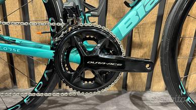 Bicicletta demo della flotta Bianchi utilizzate per un breve test. Taglia 47, adatta ad un' altezza di 160-170 cm. Componenti Telaio : Specialissima RC carbon HM, only electronic groupsets, fully internal cable routing, headset Acros ICR, direct mount brakes, BB-PressFit Forcella : Specialissima RC full Carbon HM aero, integrated head, disc, 1.5" head, 12x100mm thru axle Materiale della forcella : Carbon Deragliatore anteriore : Shimano Dura-Ace Di2 Deragliatore posteriore : Shimano Dura-Ace Di2 Pedivella : Shimano Dura-Ace 170mm Freni : Shimano Dura-Ace Ruote : Reparto Corse RC Carbon 33mm, Cuscinetti sigillati ceramici, tubeless-ready, Peso 1370gr Reggisella : Specialissima Full Carbon Aero special Manubrio integrato: included in the stem 400x110mm