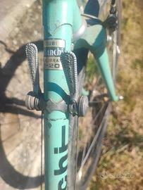 Bicicletta eroica modello campione del mondo 1973-74 perfettamente funzionante (attualmente utilizzata da passeggio come si può notare da campanello, lucchetto e coprisella) con cambio a leva Campagnolo 2x6, manubrio Cinelli e copertoni da 28 praticamente nuovi. Insieme alla bici cedo anche i pedali con gabbie in aggiunta a quelli attualmente montati.