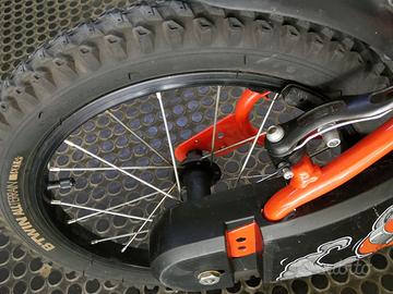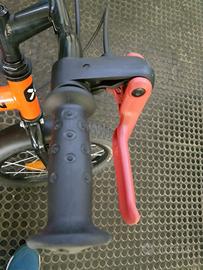 Sistema Frenante: La bici è dotata delle leve "Stop Easy" (quelle arancioni/rosse). Sono brevettate per essere azionate più facilmente dalle mani piccole dei bambini rispetto alle leve tradizionali. Pneumatici: Monta copertoni B'Twin All-Terrain. Il battistrada ancora in buono stato. Sicurezza: Il carter catena integrale (quello con il disegno del robot) evita che il bambino si sporchi o, peggio, che i vestiti rimangano impigliati nella catena.