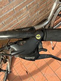 Bici da città in buone condizioni, telaio argento, sella nera e portapacchi molto comodo per la spesa o per trasportare oggetti.
