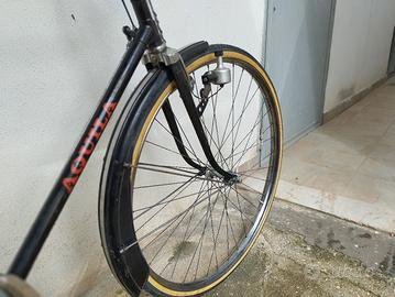 Vendo bici da uomo, misura 28 pollici, marca Aquila degli anni sessanta con i freni a bacchetta. La bici è stata revisionata in tutte le sue parti conservando tutti i componenti originali dell'epoca tranne i copertoni e le camere d'aria che sono nuovi ma con le misure dell'epoca. La bici conserva l'originale patina del tempo trascorso ma è perfettamente funzionante. Considerate le dimensioni, non spedisco.