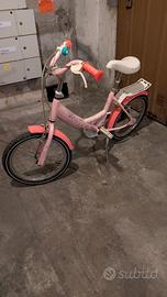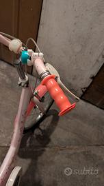 Vendo bici per bambina, colore rosa con motivi di rose e scritta "Barbie in The 12 Dancing Princesses" sul telaio.