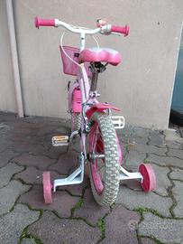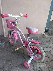 Bici per bambina con rotelle stabilizzatrici rimovibili, cestino e campanello. Ruote 14", quindi adatta indicativamente da 3 a 5 anni. Perfettamente funzionante.