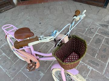 Bicicletta da bambina vintage rosa con cestino Vendo graziosa bicicletta da bambina colore rosa pastello, dallo stile vintage, completa di cestino anteriore in vimini, parafanghi e portapacchi posteriore. La bici è molto carina e adatta a bambine, perfetta per passeggiate, giardino o prime uscite in sicurezza. Caratteristiche: •colore rosa pastello •cestino anteriore •sella marrone •copricatena •parafanghi •portapacchi posteriore •ruote da bambina Condizioni: Usata, in buone condizioni generali, con normali segni del tempo e di utilizzo. Ideale per: bambine che cercano una bici comoda, femminile e dallo stile elegante. Prezzo: 70€