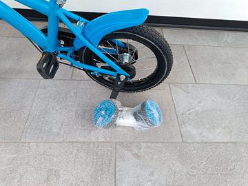 Bici azzurra come nuova con cavalletto, campanello nuovo e con ruotine stabilizzatrici mai utilizzate.