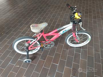Bici da bambino fino ai 6 anni. Completamente revisionata: camere d'aria e copertoni nuovissimi, cavetti freni e guaine nuove, manubrio e leve freno nuove, con ruotine da bambino posteriori per rimanere in equilibrio da fermi.