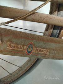 vendo bici Bianchi da restaurare, dei primi del '900. Freni a Bacchetta funzionanti, trasmissione funzionante. tutto originale, le ruote girano. completa di paragonna, sella con molle, dinamo e luci anteriori e posteriori, campanello e portapacchi posteriore. Tutti pezzi originali.