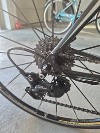 La bicicletta nell'immagine sembra essere una Bianchi 928 SL (Super Leggera). Telaio in carbonio: Progettato per offrire un equilibrio tra leggerezza e rigidità.Design classico: Presenta i colori distintivi neri con accenti celesti tipici del marchio Bianchi.Componentistica di alta gamma: gruppo Shimano. Usata un paio di volte. Sono alto 1.75 metri.
