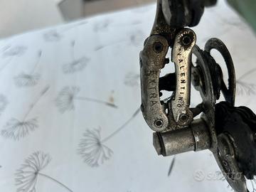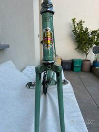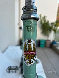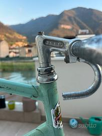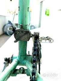 Bianchi da corsa vintage anni ’60/’70 – originale Campagnolo Descrizione: Vendo bici da corsa d’epoca Bianchi, colore originale celeste Bianchi, completa di componentistica coeva. Un pezzo autentico di storia del ciclismo italiano, ideale per collezionisti, appassionati di vintage o per chi vuole un progetto di restauro. Caratteristiche principali: •Marca: Bianchi •Periodo: fine anni ’60 – primi anni ’70 •Telaio in acciaio con congiunzioni saldobrasate (numerazione originale visibile: 00555) •Colore: celeste Bianchi originale •Cambio posteriore: Campagnolo Valentino Extra •Deragliatore anteriore: Campagnolo •Guarnitura: in acciaio originale Bianchi •Attacco manubrio: 3ttt (Tecno Tubo Torino) •Pedali vintage in ferro/alluminio •Sterzo e serie sterzo marchiati Italy •Stemma frontale smaltato “Edoardo Bianchi – Made in Italy” •Condizioni: da restauro, telaio sano senza crepe o rotture, vernice vissuta, componenti originali presenti. Nota bene: La bici è venduta come vista e piaciuta, nello stato attuale. Ottima base per restauro filologico o per allestimento da collezione.