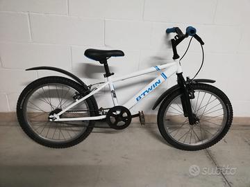 Bici mountain bike bimbo marca B'twin modello Racing Boy 300, 20 pollici, completa dei seguenti accessori: parafanghi anteriore e posteriore e cavalletto.