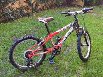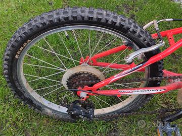 Vendo bicicletta MTB ruota 20 pollici. Forcella anteriore ammortizzata. Cambio Shimano 1 X 6. Manopole e leve freni nuove. Qualche punto di ruggine sulla forcella, ma globalmente in ottime condizioni.