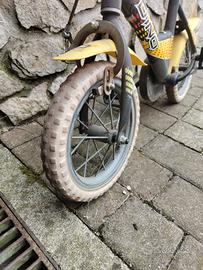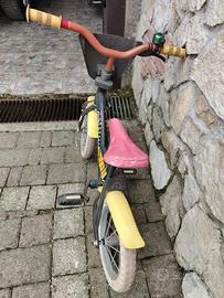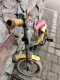 bici da bambino alle prime esperienze. pedale a scatto fisso. se pedali indietro si ferma. il freno è da registrare e la bici da spolverare ma funzionante, con campanello.