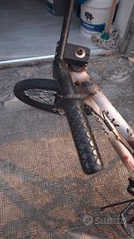 una bici che ha più di 10 anni, i freni sono stati tolti, le ruote non sono originali, il sedile è rovinato, il manubrio è un po' rotto, ma la bici tutto sommato continua a funzionare.