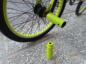 Bici funzionante ma con evidenti segni come sporcizia graffi e ruggine. Compresi i due picchetti (pegs), uno dei quali da rifilettare.