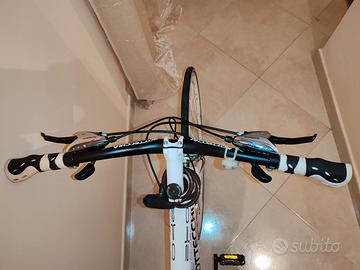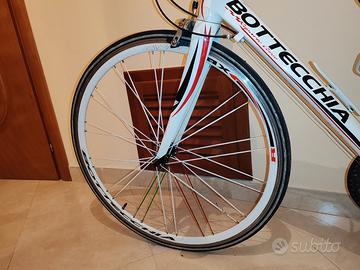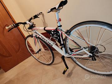 Bici Bottecchia Duello Reparto corse, ibrida, Taglia S, Cambio Shimano Sora 27 velocità, tripla corona, telaio in alluminio con forcella in carbonio, peso 10 kg, manubrio con manopole in gomma, conodo portaborraccia, freni vbrake, copertoncini 700x21c, cerchi in alluminio con raggi piatti di colore bianco, rosso e verde. Bici in ottime condizioni. Vendo per non uso.