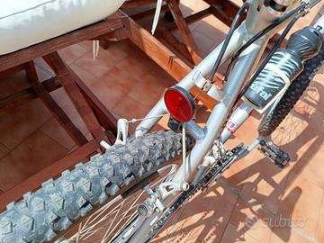 Cedo per inutilizzo bellissima bicicletta mountain bike vintage del 1990, marca Bottecchia, modello 883 R Taiga. In ottime condizioni estetiche, pronta all'uso. Revisionata: Cambiate gomme originali con pneumatici da sterrato 2.10 pollici, pastiglie freni nuove, pulita e lubrificata nelle parti meccaniche, cambio Shimano Alivio a 21 rapporti (3 X 7) perfettamente registrato e sostituito il rivestimento in ecopelle del sellino originale. Misura XL per persone alte da 1,75 m a 1,90 m. Completa di tutti gli accessori originali + computer contachilometri digitale a filo, in coerenza con l'epoca della bicicletta. Usata pochissimo e sempre su strada asfaltata: mai praticato ciclocross o fuoristrada. Le immagini pubblicate corrispondono esattamente all'oggetto nello stato in cui è oggi. P.S.: La borraccia visibile in foto non è compresa nella vendita.