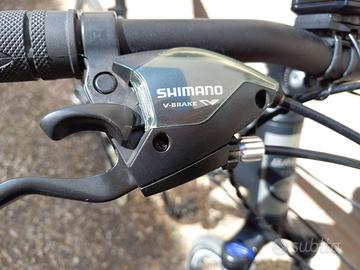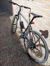 Bici Brera Cicli modello "Amsterdam Cross", con forcella ammortizzata e assetto da cross bike, vale a dire adatta a strade asfaltate e sterrati facili. Ha ruote da 28" e telaio in alluminio da 50, anche se ha geometrie un po' piccole (sembra più una 48); cambio 21 rapporti, freni a disco meccanici, forcella SR Suntour NEX bloccabile, il manubrio è regolabile nell'inclinazione. Gomme ancora in buone condizioni. La cedo allestita così come la vedete, pronta all'uso. Aggiungo inoltre in regalo una camera d'aria di ricambio nuova, leve per smontare le gomme e una borsa Decathlon da montare a cavallo del telaio con scomparto per smartphone e tasche laterali.