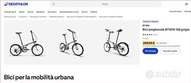 Vendo due bici in oggetto, prezzo 120 euro l'una, usate ma in buono stato e con pochi chilometri. Pieghevoli nella struttura e nei pedali. Ottime per camper e bagaglio auto. cambio a 6 rapporti, dotate di parafanghi. Consegna a mano, zona Treviso, Prezzo pieno ad oggi alla decathlon 299,99 euro.