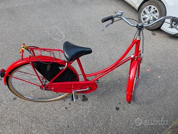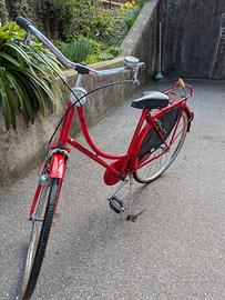 Vendo bicicletta di colore rosso In buone condizioni generali. Dotata di: •freni funzionanti, sella integra di pelle, cavalletto, portapacchi posteriore con lucchetto e ruote da 26”. Bici pronta all’uso, senza bisogno di interventi.
